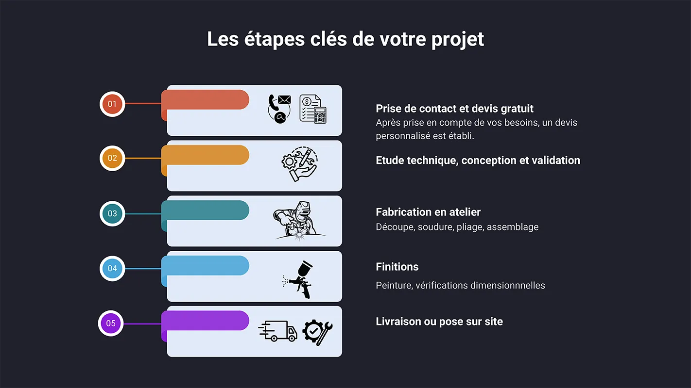 Nous intervenons sur de nombreux matériaux : acier, acier galvanisé, inox, acier peint, en fonction de vos contraintes de résistance, d’environnement ou de sécurité.